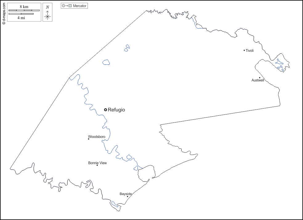 d-maps > संयुक्त राज्य > टेक्सास > रिफ्यूजिओ काउंटी > बाह्यरेखा, जल-सर्वेक्षण, मुख्य शहरों, नाम, सफेद