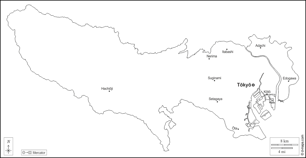 d-maps > एशिया > जापान > टोक्यो > बाह्यरेखा, मुख्य शहरों, नाम, सफेद