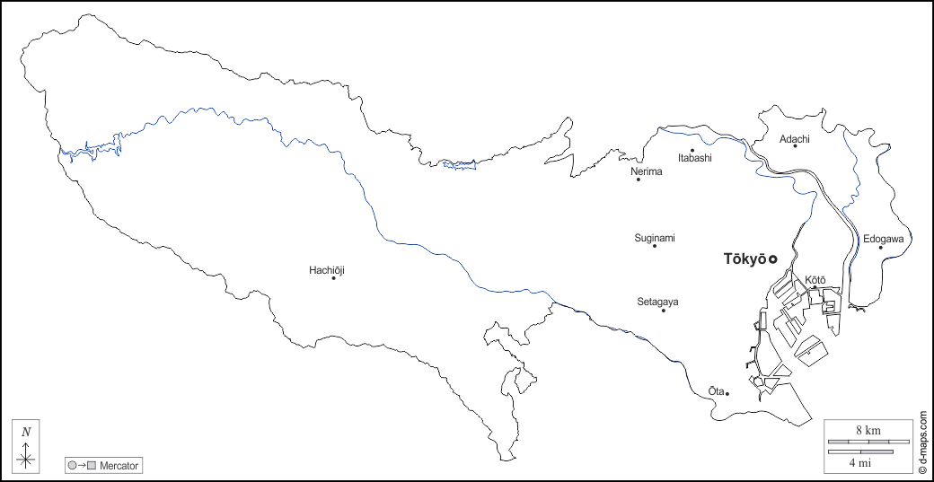 d-maps > एशिया > जापान > टोक्यो > बाह्यरेखा, जल-सर्वेक्षण, मुख्य शहरों, नाम, सफेद