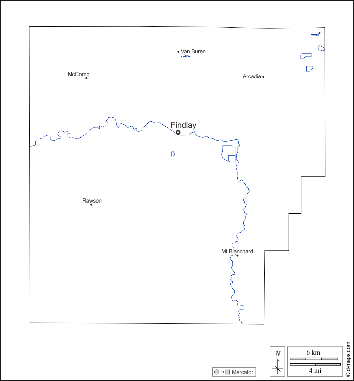 d-maps > संयुक्त राज्य > ओहायो > हेनकॉक काउंटी > बाह्यरेखा, जल-सर्वेक्षण, मुख्य शहरों, नाम, सफेद