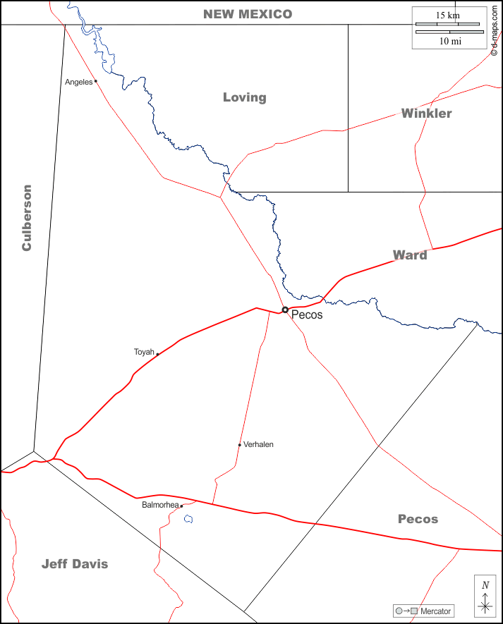 d-maps > संयुक्त राज्य > टेक्सास > रीव्स काउंटी > सीमाओं, जल-सर्वेक्षण, मुख्य शहरों, सड़कों, नाम, सफेद