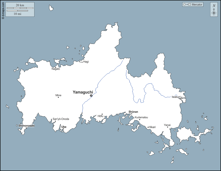 d-maps > एशिया > जापान > यामागुची > बाह्यरेखा, जल-सर्वेक्षण, मुख्य शहरों, नाम