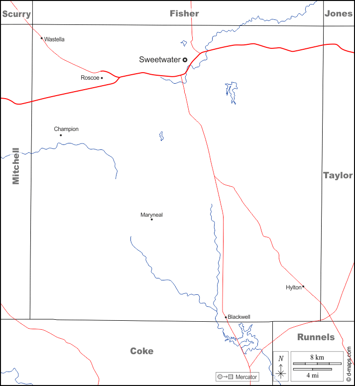 d-maps > संयुक्त राज्य > टेक्सास > नोलन काउंटी > सीमाओं, जल-सर्वेक्षण, मुख्य शहरों, सड़कों, नाम, सफेद