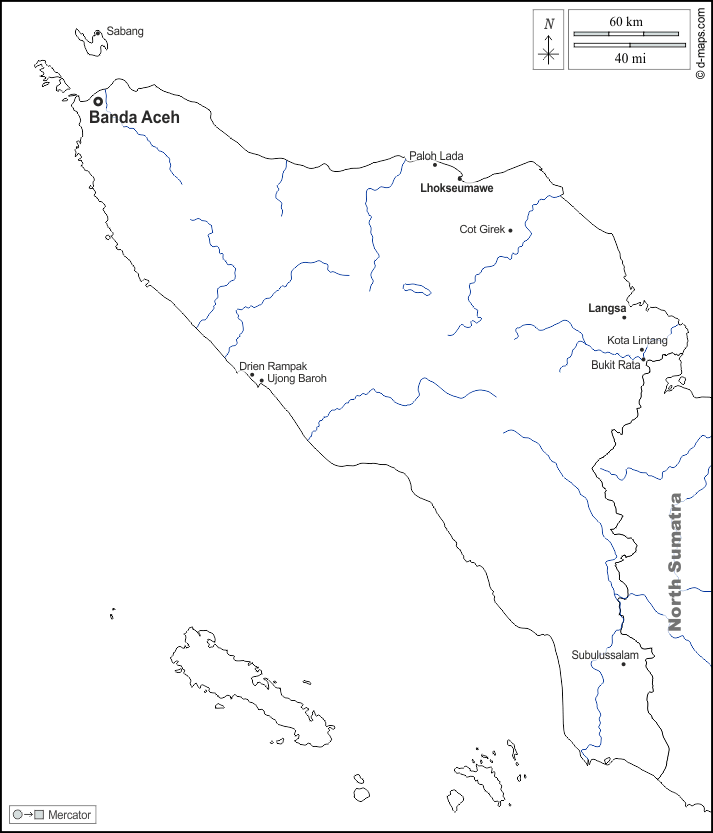 d-maps > एशिया > इंडोनेशिया > आचेह > सीमाओं, जल-सर्वेक्षण, मुख्य शहरों, नाम, सफेद