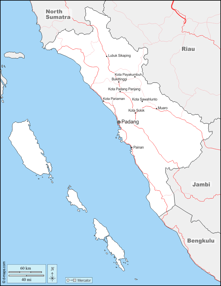 d-maps > एशिया > इंडोनेशिया > पश्चिम सुमात्रा > सीमाओं, मुख्य शहरों, सड़कों, नाम