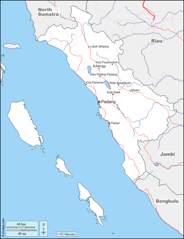 d-maps > एशिया > इंडोनेशिया > पश्चिम सुमात्रा > सीमाओं, जल-सर्वेक्षण, मुख्य शहरों, सड़कों, नाम