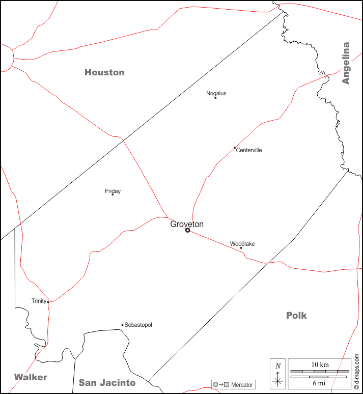 d-maps > संयुक्त राज्य > टेक्सास > ट्रिनिटी काउंटी > सीमाओं, मुख्य शहरों, सड़कों, नाम, सफेद