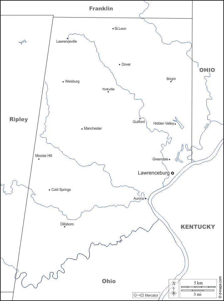 d-maps > संयुक्त राज्य > इंडियाना > डियरबॉर्न काउंटी > सीमाओं, जल-सर्वेक्षण, मुख्य शहरों, नाम, सफेद