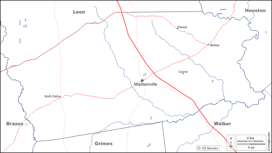 d-maps > संयुक्त राज्य > टेक्सास > मैडिसन काउंटी > सीमाओं, जल-सर्वेक्षण, मुख्य शहरों, सड़कों, नाम, सफेद