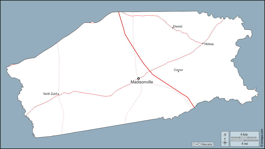 d-maps > संयुक्त राज्य > टेक्सास > मैडिसन काउंटी > बाह्यरेखा, मुख्य शहरों, सड़कों, नाम