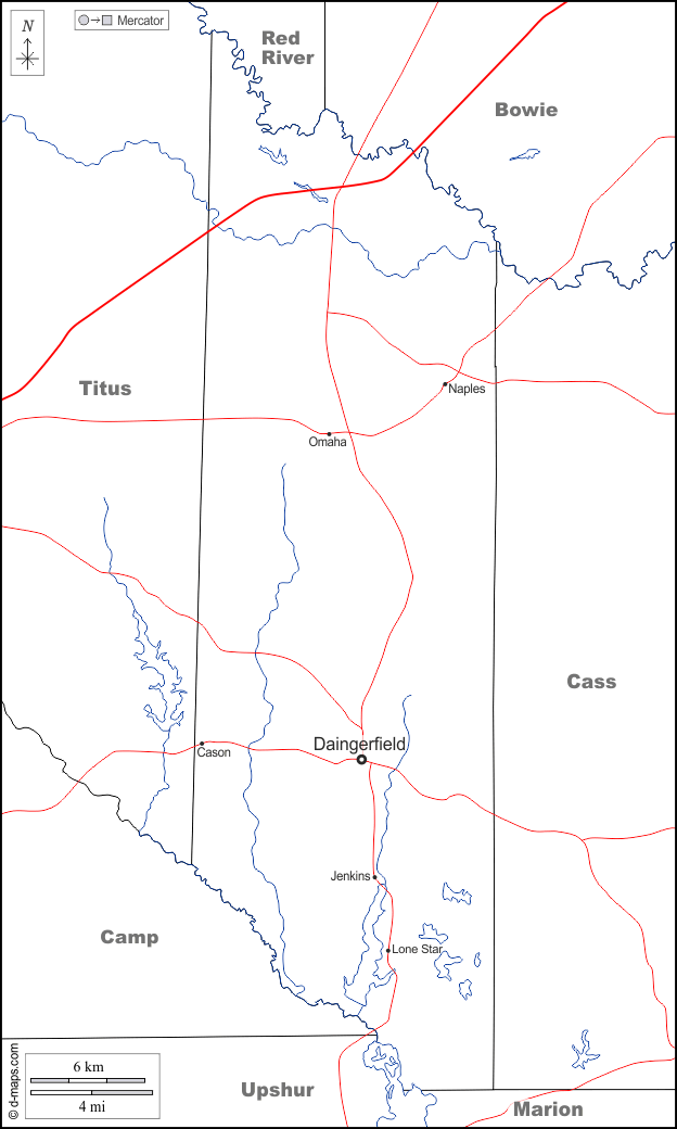 d-maps > संयुक्त राज्य > टेक्सास > मॉरिस काउंटी > सीमाओं, जल-सर्वेक्षण, मुख्य शहरों, सड़कों, नाम, सफेद