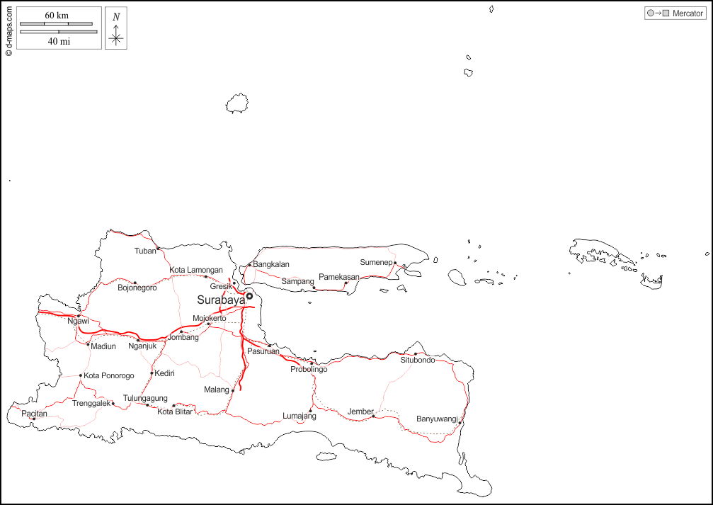 d-maps > एशिया > इंडोनेशिया > पूर्व जावा > बाह्यरेखा, मुख्य शहरों, सड़कों, नाम, सफेद