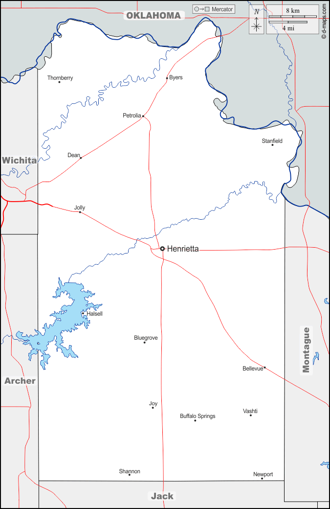 d-maps > संयुक्त राज्य > टेक्सास > क्ले काउंटी > सीमाओं, जल-सर्वेक्षण, मुख्य शहरों, सड़कों, नाम