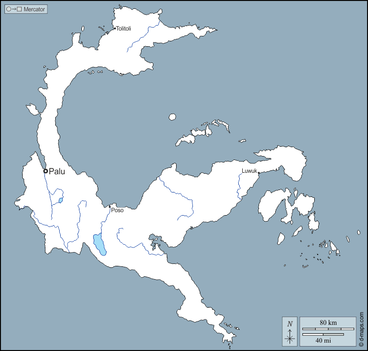 d-maps > एशिया > इंडोनेशिया > मध्य सुलावेसी > बाह्यरेखा, जल-सर्वेक्षण, मुख्य शहरों, नाम