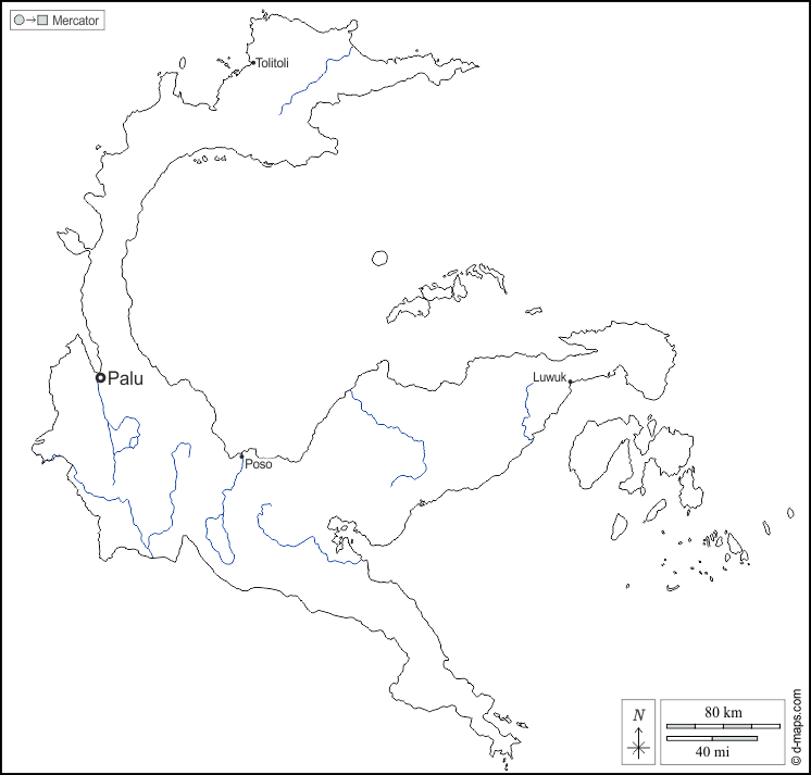 d-maps > एशिया > इंडोनेशिया > मध्य सुलावेसी > बाह्यरेखा, जल-सर्वेक्षण, मुख्य शहरों, नाम, सफेद