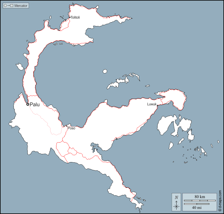 d-maps > एशिया > इंडोनेशिया > मध्य सुलावेसी > बाह्यरेखा, मुख्य शहरों, सड़कों, नाम