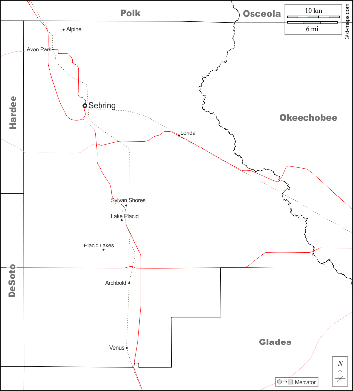 d-maps > संयुक्त राज्य > फ्लोरिडा > हाइलैंड्स काउंटी > सीमाओं, मुख्य शहरों, सड़कों, नाम, सफेद