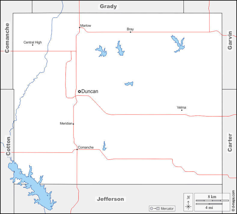 d-maps > संयुक्त राज्य > ओकलाहोमा > स्टीफंस काउंटी > सीमाओं, जल-सर्वेक्षण, मुख्य शहरों, सड़कों, नाम