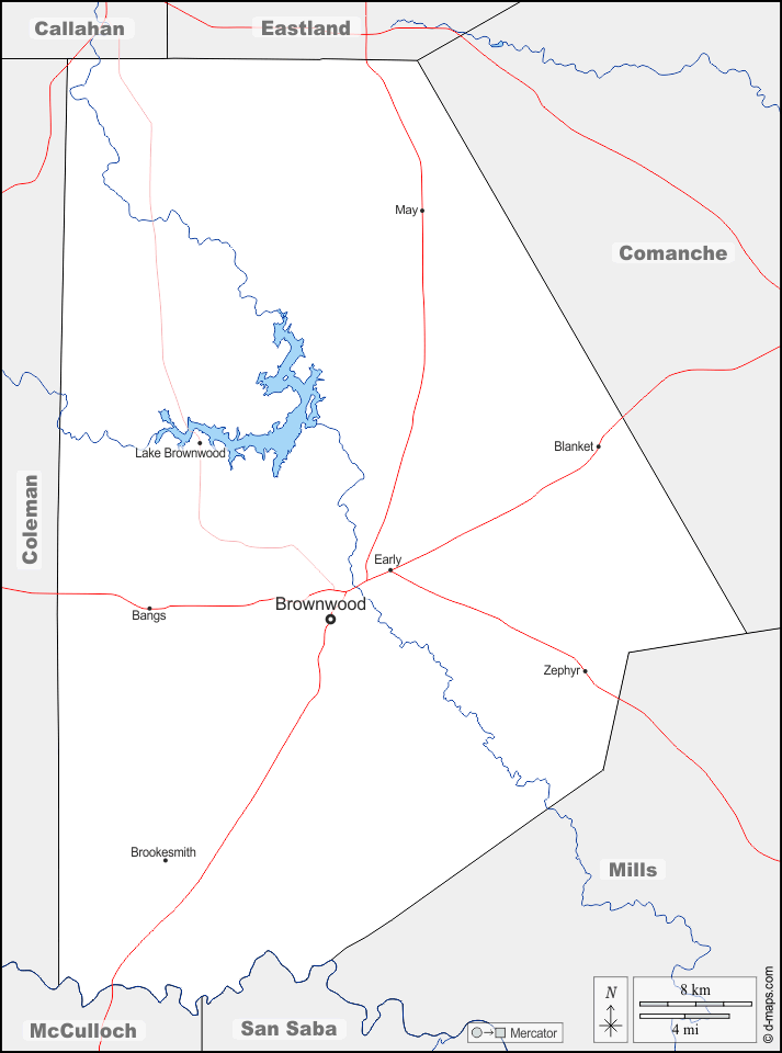 d-maps > संयुक्त राज्य > टेक्सास > ब्राउन काउंटी > सीमाओं, जल-सर्वेक्षण, मुख्य शहरों, सड़कों, नाम
