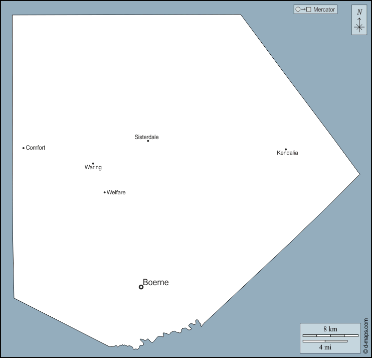 d-maps > संयुक्त राज्य > टेक्सास > केंडल काउंटी > बाह्यरेखा, मुख्य शहरों, नाम