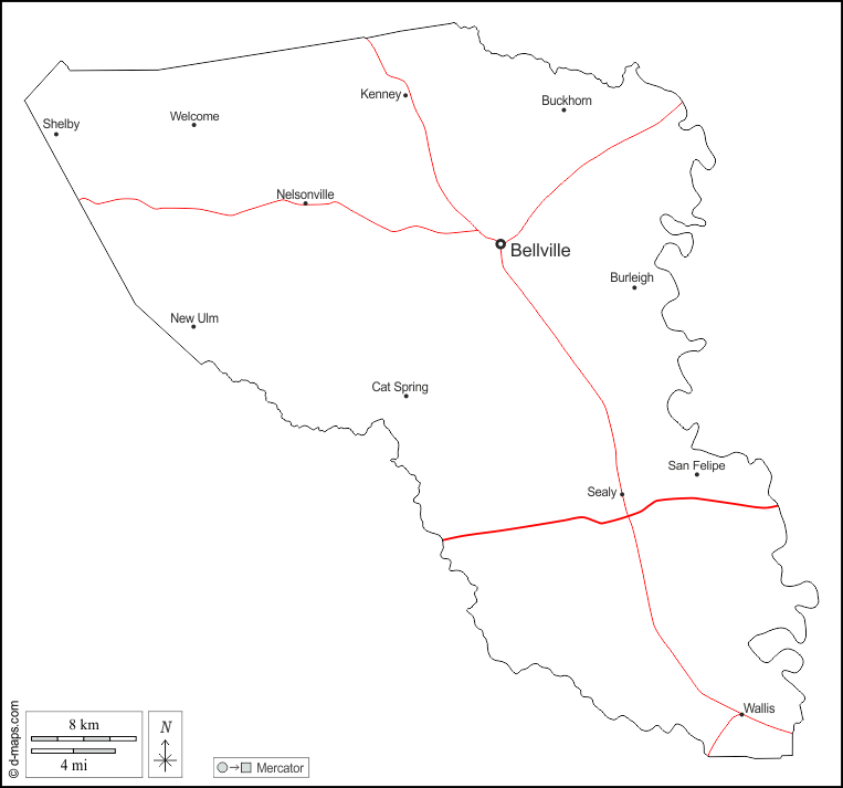 d-maps > संयुक्त राज्य > टेक्सास > ऑस्टिन काउंटी > बाह्यरेखा, मुख्य शहरों, सड़कों, नाम, सफेद