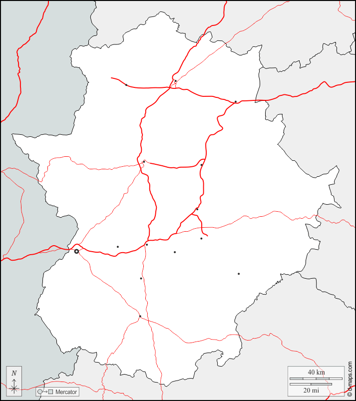 d-maps > यूरोप > स्पेन > एक्स्ट्रिमादुरा > सीमाओं, मुख्य शहरों, सड़कों