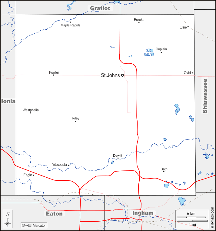 d-maps > संयुक्त राज्य > मिशिगन > क्लिंटन काउंटी > सीमाओं, जल-सर्वेक्षण, मुख्य शहरों, सड़कों, नाम