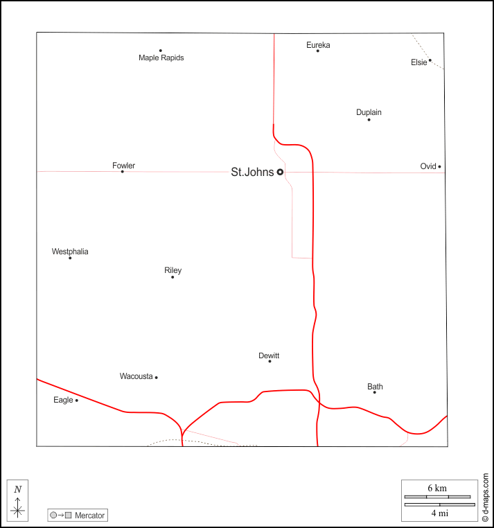d-maps > संयुक्त राज्य > मिशिगन > क्लिंटन काउंटी > बाह्यरेखा, मुख्य शहरों, सड़कों, नाम, सफेद