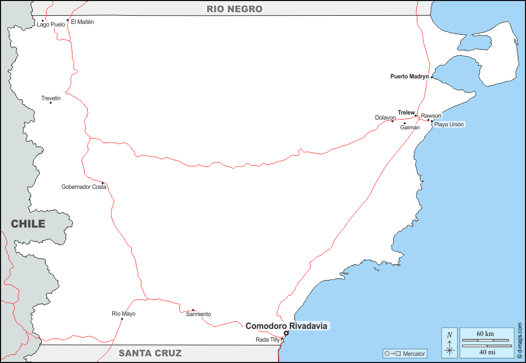 d-maps > महाअमेरिका > अर्जेंटीना > चुबुत प्रांत > सीमाओं, मुख्य शहरों, सड़कों, नाम