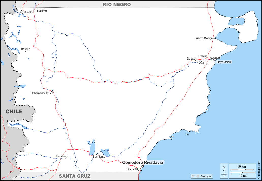 d-maps > महाअमेरिका > अर्जेंटीना > चुबुत प्रांत > सीमाओं, जल-सर्वेक्षण, मुख्य शहरों, सड़कों, नाम