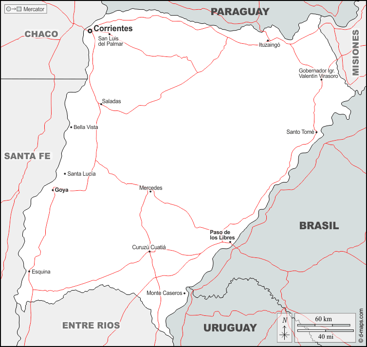 d-maps > महाअमेरिका > अर्जेंटीना > कोरिएंटेस प्रांत > सीमाओं, मुख्य शहरों, सड़कों, नाम