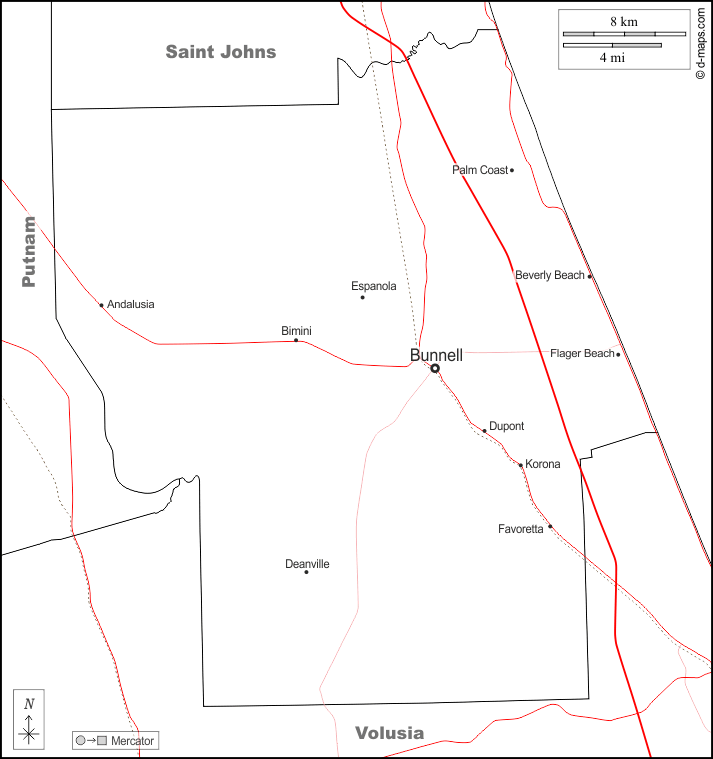d-maps > संयुक्त राज्य > फ्लोरिडा > फ्लैग्लर काउंटी > सीमाओं, मुख्य शहरों, सड़कों, नाम, सफेद