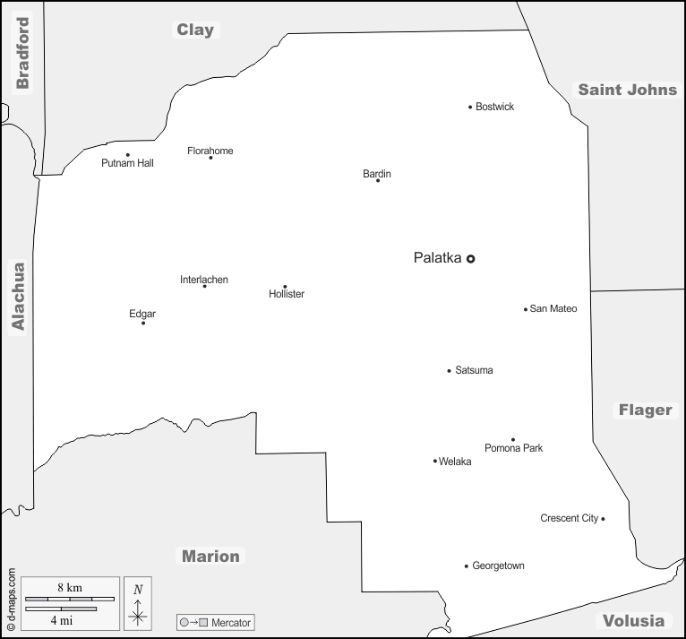 d-maps > संयुक्त राज्य > फ्लोरिडा > पुतनाम काउंटी > सीमाओं, मुख्य शहरों, नाम