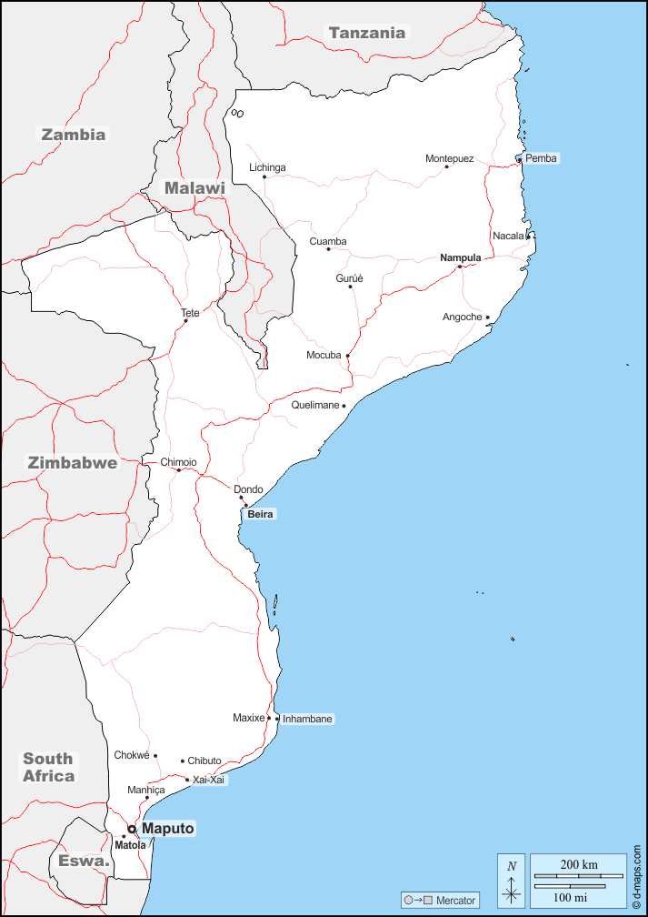 d-maps > अफ्रीका > मोजाम्बिक > मोजाम्बिक > सीमाओं, मुख्य शहरों, सड़कों, नाम