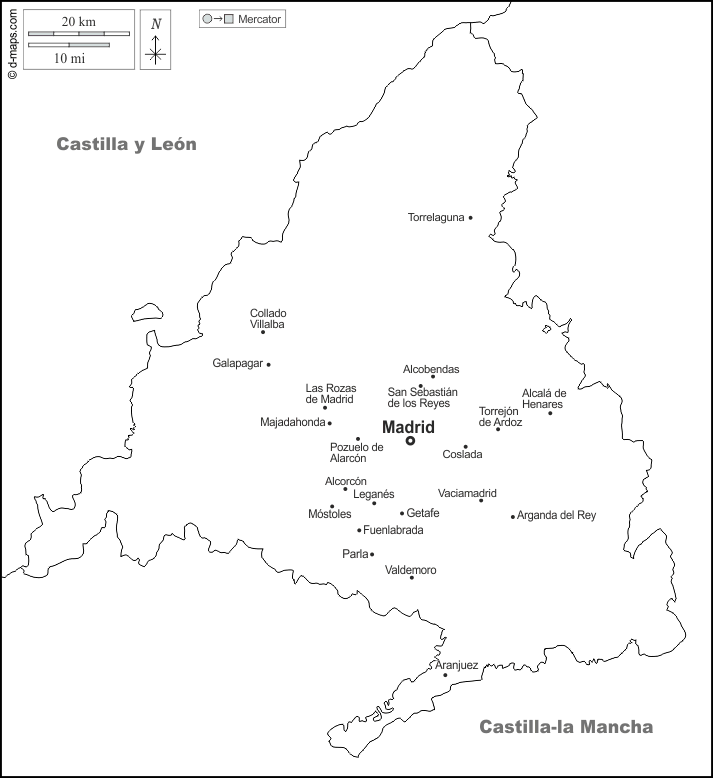 d-maps > यूरोप > स्पेन > मैड्रिड > सीमाओं, मुख्य शहरों, नाम, सफेद