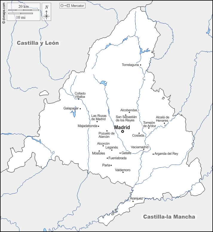 d-maps > यूरोप > स्पेन > मैड्रिड > सीमाओं, जल-सर्वेक्षण, मुख्य शहरों, नाम