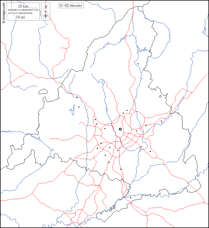 d-maps > यूरोप > स्पेन > मैड्रिड > सीमाओं, जल-सर्वेक्षण, मुख्य शहरों, सड़कों, सफेद
