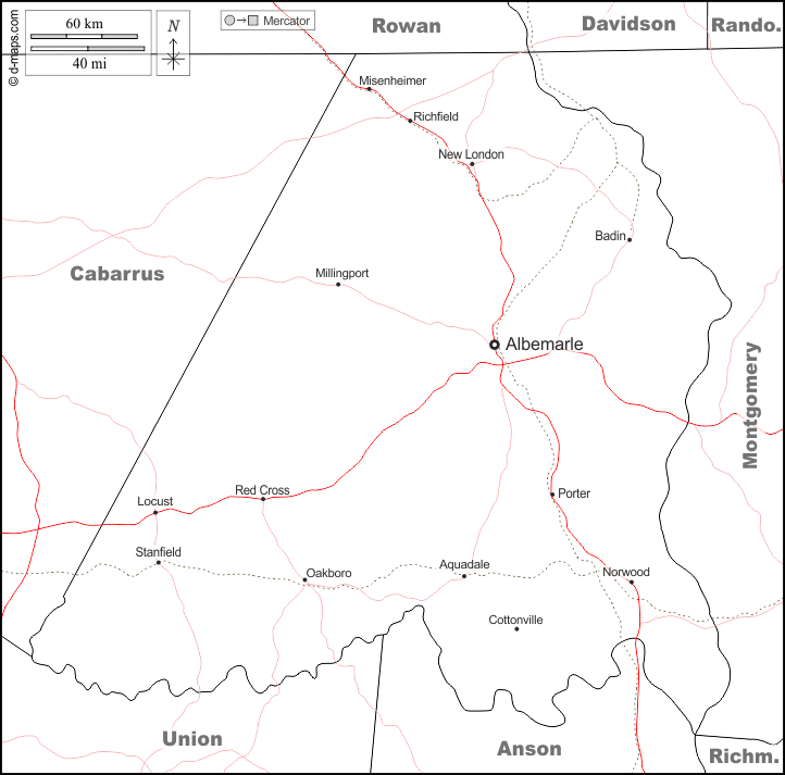 d-maps > संयुक्त राज्य > नॉर्थ कैरोलिना > स्टेनली काउंटी > सीमाओं, मुख्य शहरों, सड़कों, नाम, सफेद