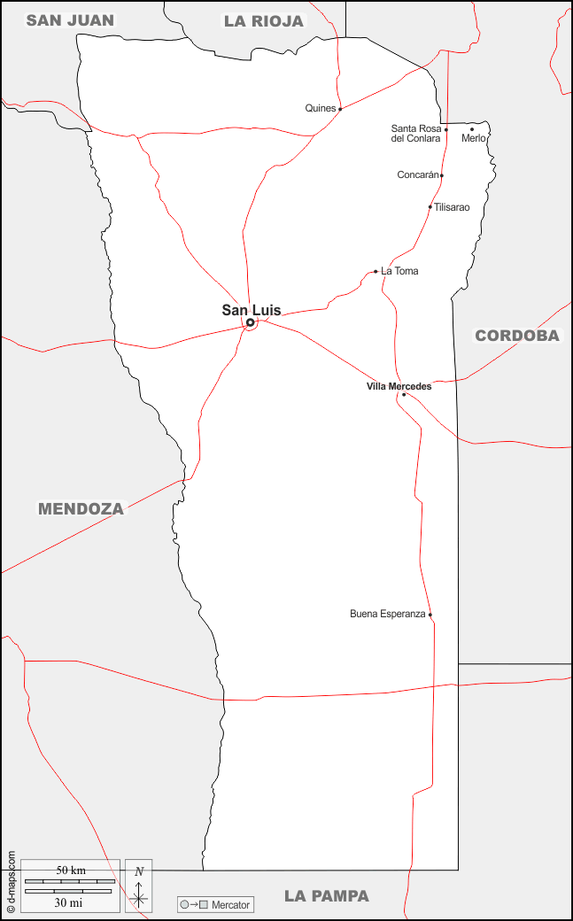 d-maps > महाअमेरिका > अर्जेंटीना > सैन लुई प्रान्त > सीमाओं, मुख्य शहरों, सड़कों, नाम