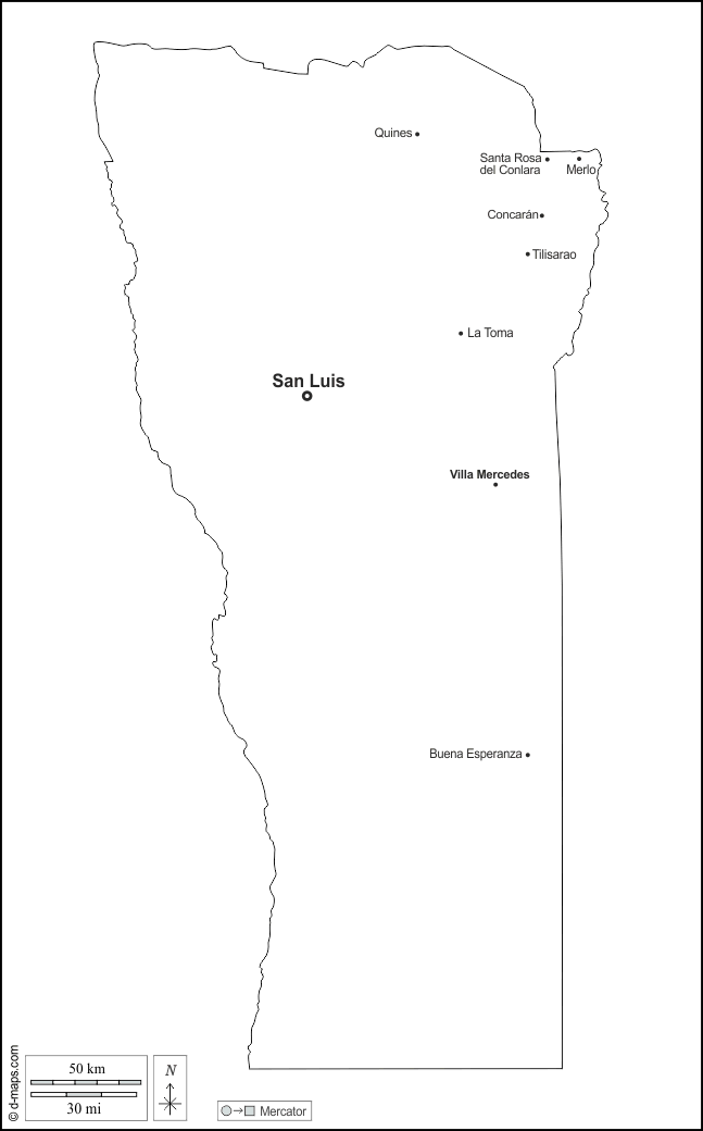 d-maps > महाअमेरिका > अर्जेंटीना > सैन लुई प्रान्त > बाह्यरेखा, मुख्य शहरों, नाम, सफेद