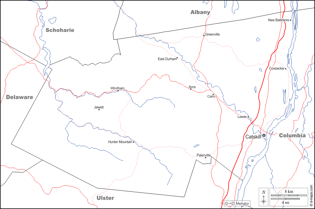 d-maps > संयुक्त राज्य > न्यू यॉर्क > ग्रीन काउंटी > सीमाओं, जल-सर्वेक्षण, मुख्य शहरों, सड़कों, नाम, सफेद