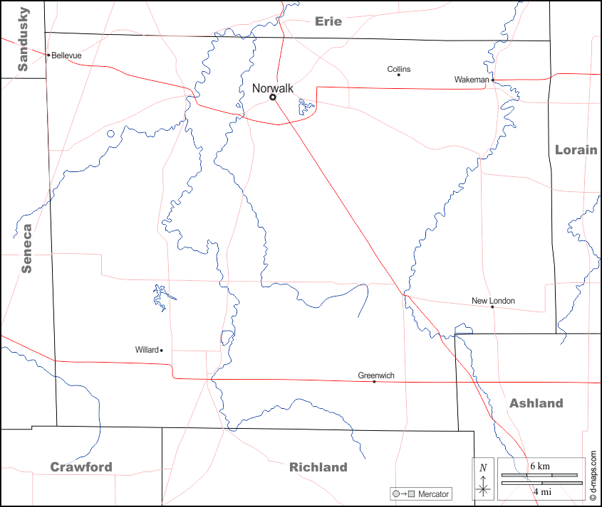 d-maps > संयुक्त राज्य > ओहायो > हुरोन काउंटी > सीमाओं, जल-सर्वेक्षण, मुख्य शहरों, सड़कों, नाम, सफेद