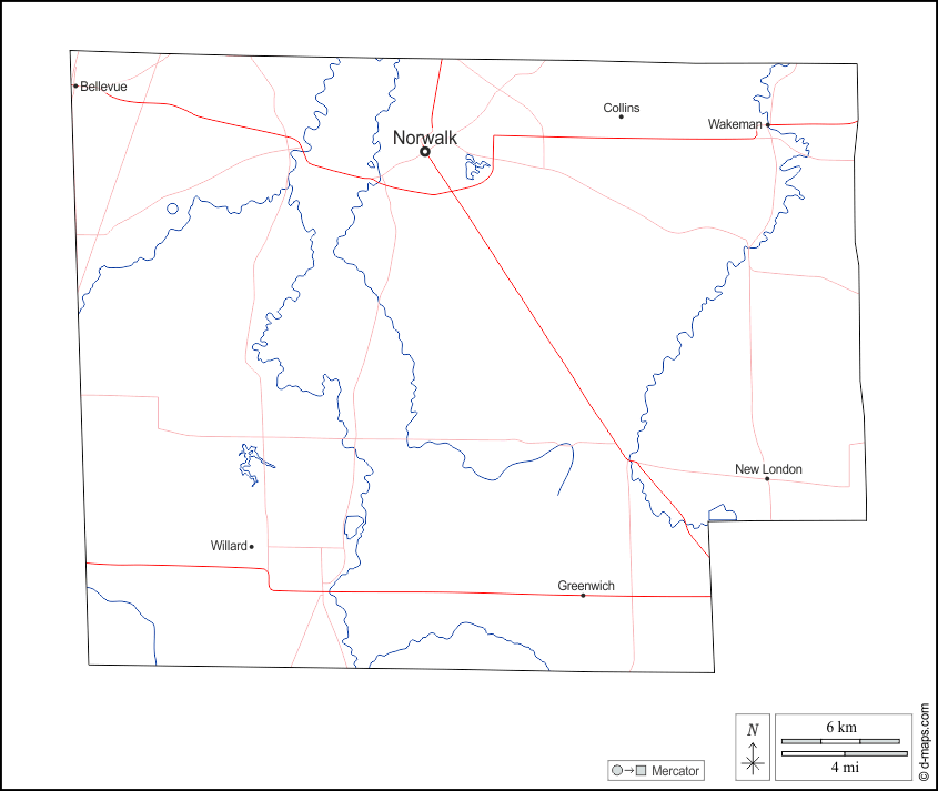 d-maps > संयुक्त राज्य > ओहायो > हुरोन काउंटी > बाह्यरेखा, जल-सर्वेक्षण, मुख्य शहरों, सड़कों, नाम, सफेद