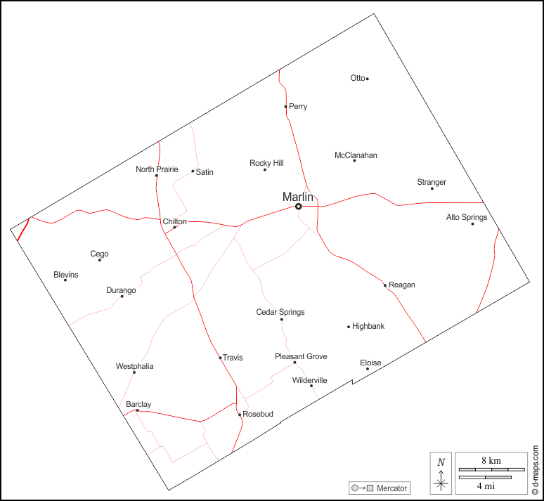 d-maps > संयुक्त राज्य > टेक्सास > फॉल्स काउंटी > बाह्यरेखा, मुख्य शहरों, सड़कों, नाम, सफेद