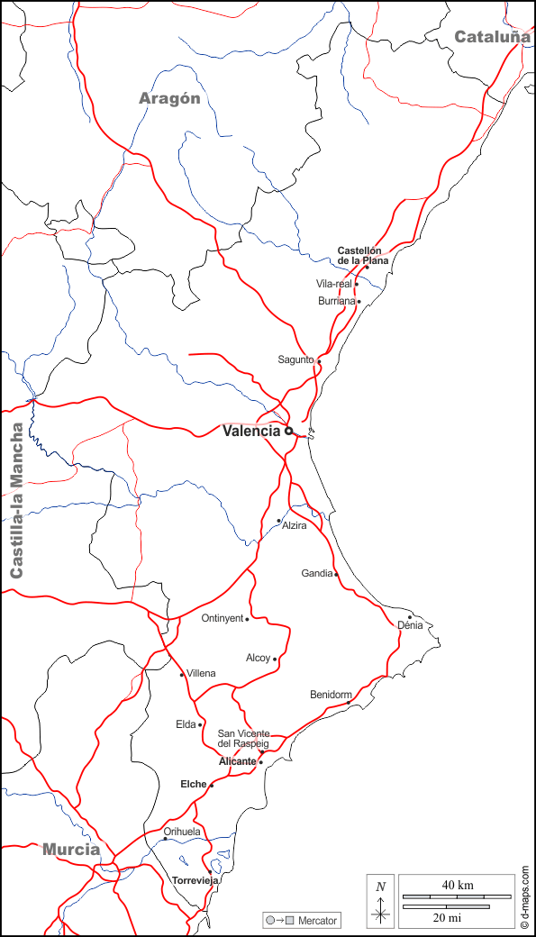 d-maps > यूरोप > स्पेन > वैलेंसियाई समुदाय > सीमाओं, जल-सर्वेक्षण, मुख्य शहरों, सड़कों, नाम, सफेद