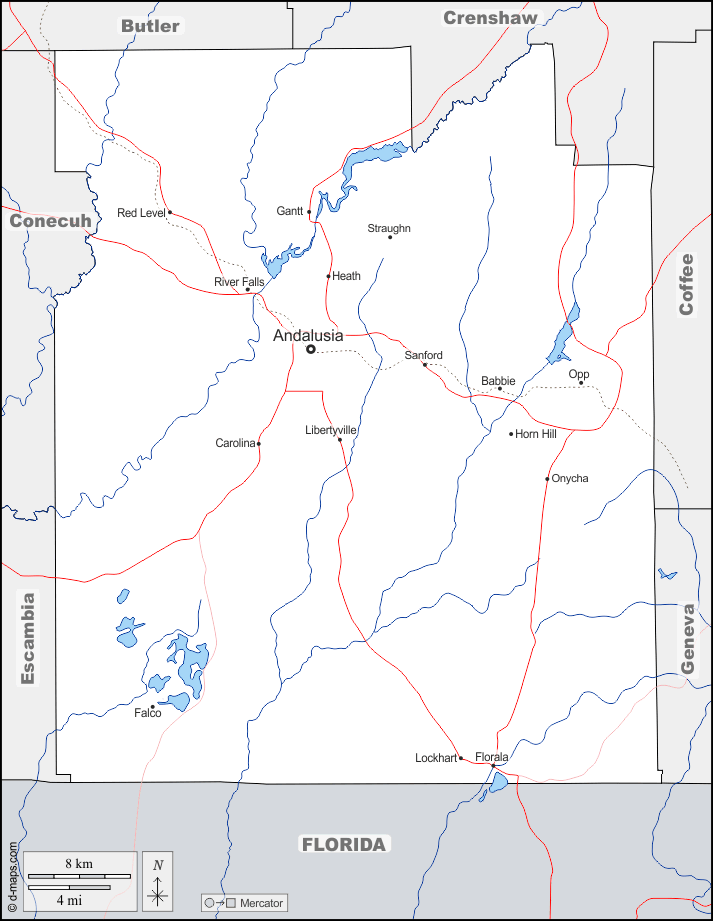d-maps > संयुक्त राज्य > अलबामा > कोविंगटन काउंटी > सीमाओं, जल-सर्वेक्षण, मुख्य शहरों, सड़कों, नाम