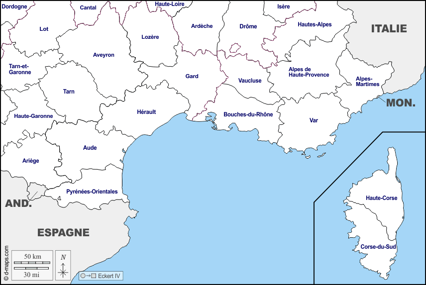 d-maps > यूरोप > फ़्रान्स > दक्षिण > सीमाओं, विभागों, नाम