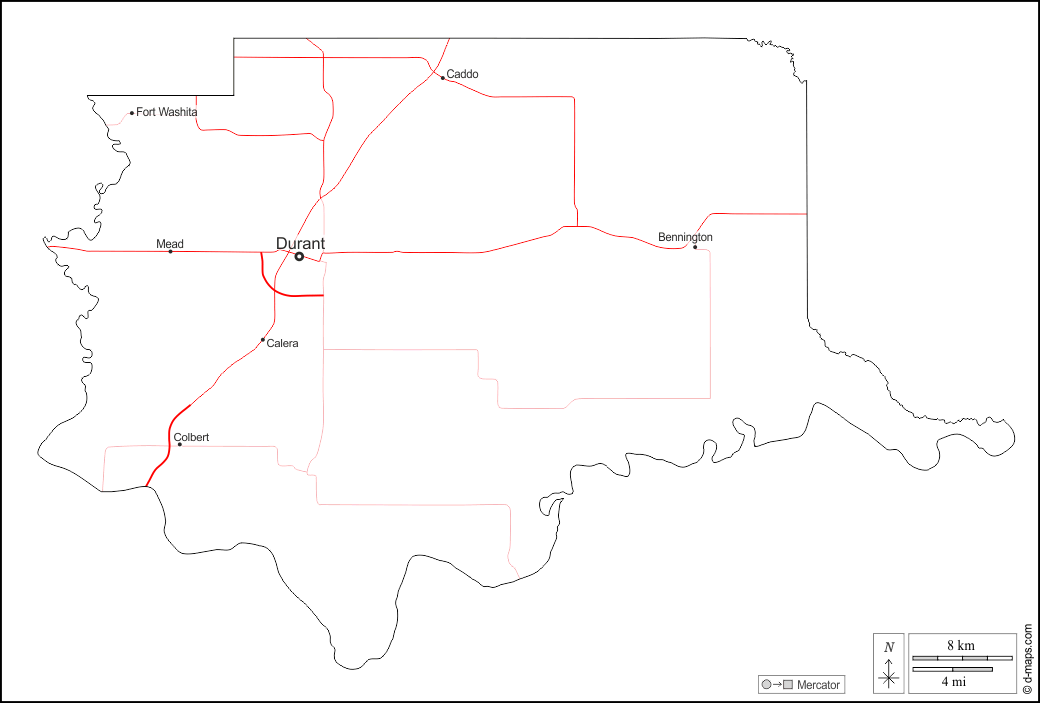 d-maps > संयुक्त राज्य > ओकलाहोमा > ब्रायन काउंटी > बाह्यरेखा, मुख्य शहरों, सड़कों, नाम, सफेद