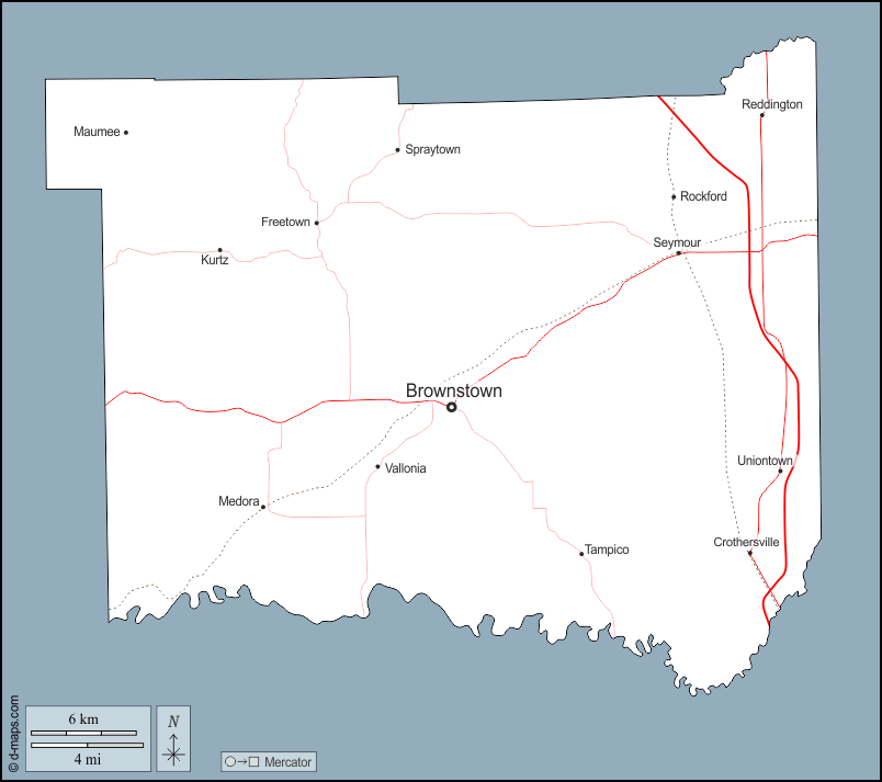 d-maps > संयुक्त राज्य > इंडियाना > जैक्सन काउंटी > बाह्यरेखा, मुख्य शहरों, सड़कों, नाम