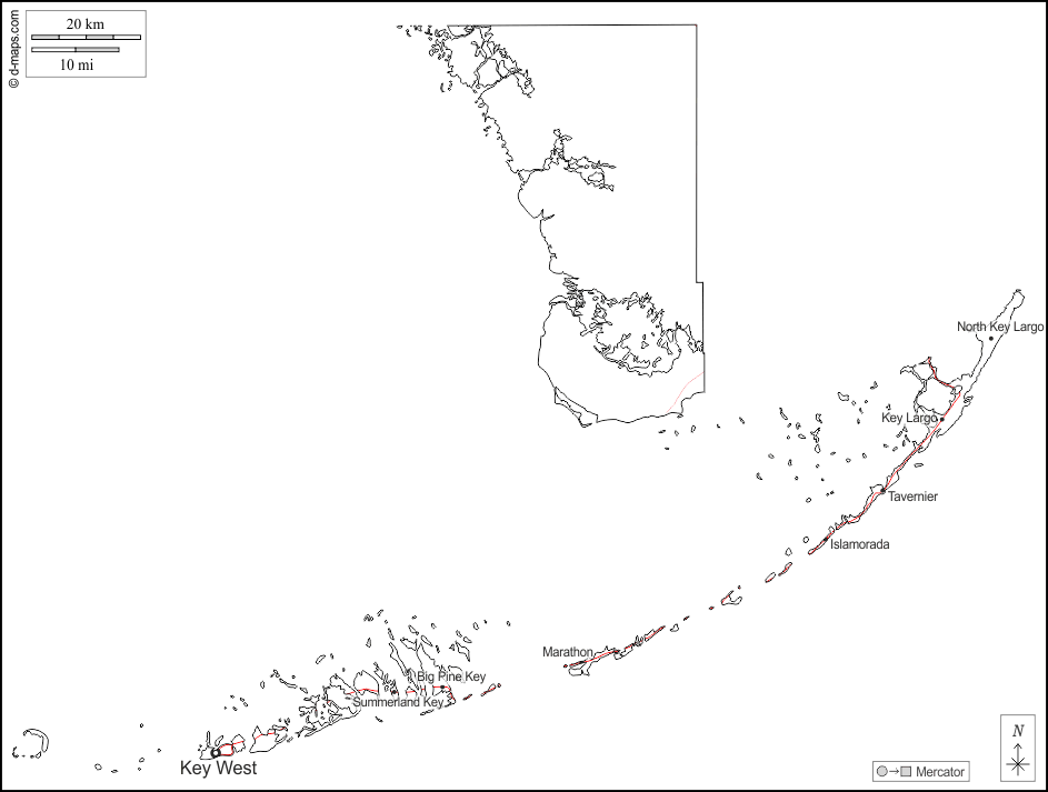 d-maps > संयुक्त राज्य > फ्लोरिडा > मोनरो काउंटी > बाह्यरेखा, मुख्य शहरों, सड़कों, नाम, सफेद